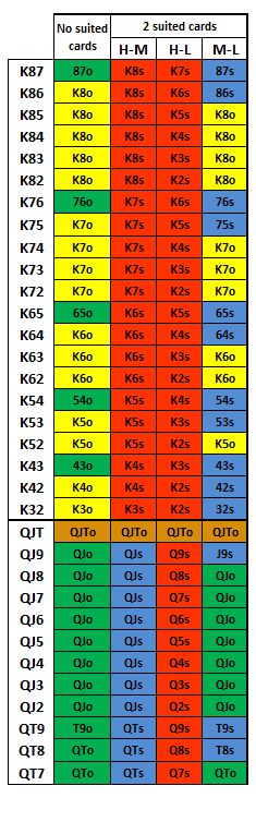 - AJx – QTx: إن أمكن، اسحب أي ورقتين متجاورتين. الأولوية الثانية هي سحب أي ورقتين A3 أو A2. وإلا، اسحب أعلى ورقتين. استثناء: مع K32، من الأفضل سحب K3 بدلاً من 32.