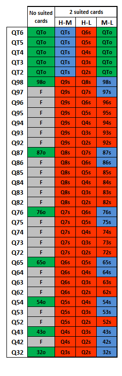 - Q9x – 53x: إن أمكن، اسحب أي ورقتين متجاورتين. الأولوية الثانية هي سحب J9 أو T8. وإلا، انسحب. السحب إلى يد ذات أوراق عالية بورقتين متطابقتين.