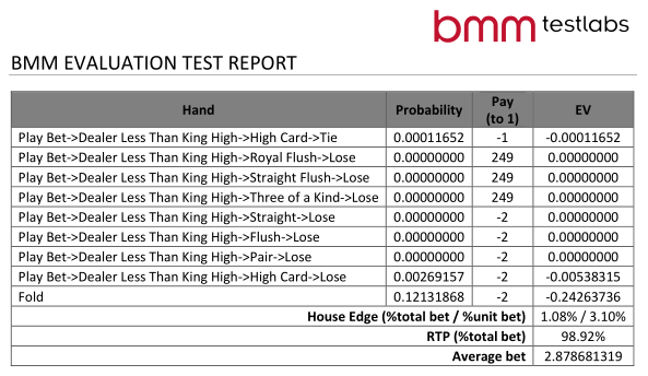 وفقًا لجدول الدفع 2، فإن ميزة المنزل بالنسبة لرهان Ante هي 2.25% وبالنسبة لرهان كل الأموال هي 0.78%.