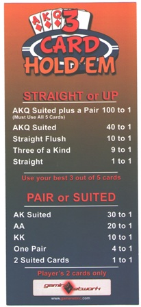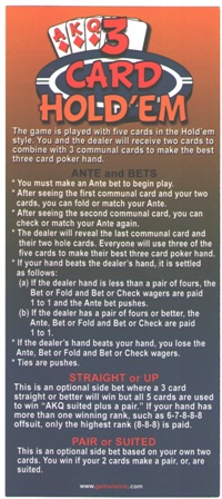 وجدتُ لعبة "ثري كارد هولدم" لأول مرة في كازينو جولدن ناجيت بلاس فيغاس في 8 مايو 2012. إنها لعبة بوكر سهلة ضد الموزع، حيث تفوز اليد الأفضل بثلاث أوراق من أصل خمس أوراق. هناك نقطتا قرار مع تقدم اليد. في ذلك الوقت، كانت شركة "جيمنج نيتورك" (التي لم تعد موجودة الآن) هي من تُسوّق اللعبة.