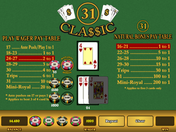 - تبدأ اللعبة بقيام اللاعب بوضع رهان Ante ورهان جانبي اختياري بقيمة Natural 31 Bonus.