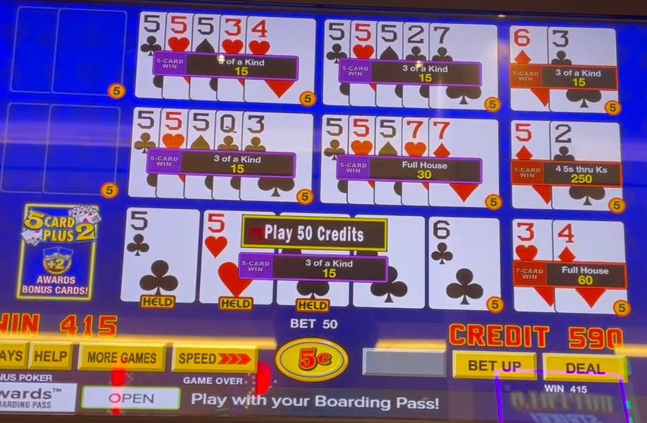 تحسنت إحدى أوراق الثلاثة المتشابهة إلى فول هاوس عند السحب. كان إجمالي الفوز في أوراق الخمسة أوراق 4 × 15 + 30 = 90. مُنحت ثلاث أوراق من أصل خمس أوراق بطاقتين إضافيتين. كانت هذه الأوراق السبع أوراق: ثلاثة أوراق، وأربعة أوراق (من 5 إلى K)، وفول هاوس (في اليد السفلية، الورقة الثانية من يمين أوراق الخمسة هي 3 أندية). كان إجمالي الفوز في أوراق السبع أوراق 15 + 250 + 60 = 325. وكان إجمالي الفوز 90 + 325 = 415.