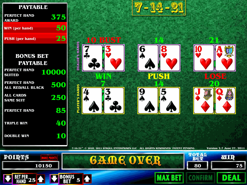 إليكم مثالاً من لعبة 7-14-21 التجريبية المجانية . راهنتُ بمبلغ 25 دولارًا على كل يد من الأيدي 7 و14 و21، و5 دولارات على رهان المكافأة.