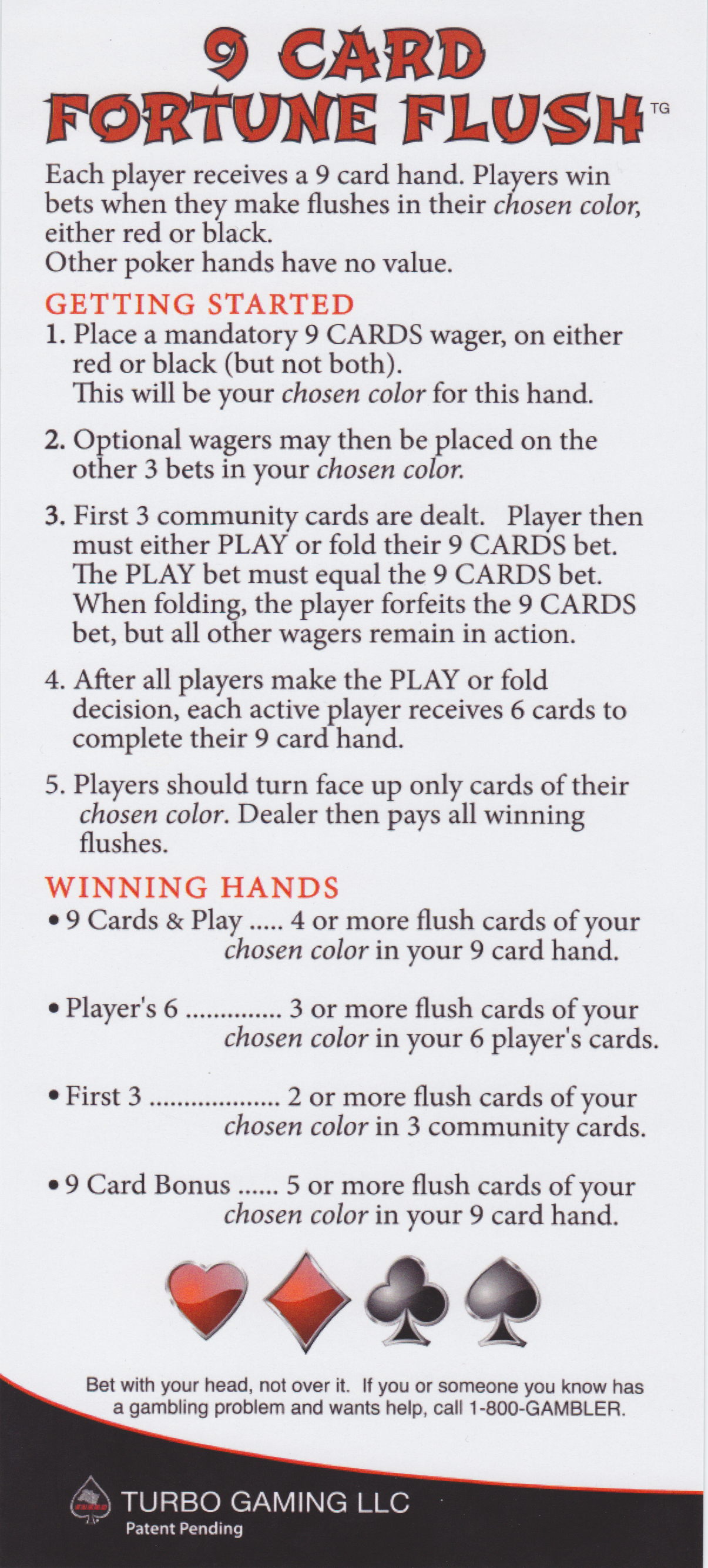 فيما يلي جدول الدفع لكل من رهانات البطاقات التسع ورهانات اللعب، والتي تعتمد على جميع البطاقات التسع.