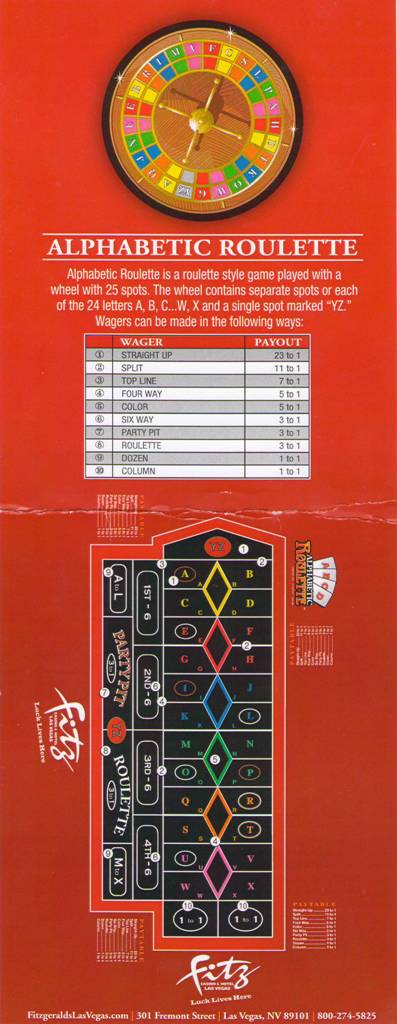 الروليت الأبجدية هي نسخة من الروليت رأيتها في مطعم فيتزجيرالد في لاس فيغاس في 7 أغسطس 2011. إنها نسخة بسيطة من الروليت تتضمن الألوان والحروف. تحتوي على 25 خانة، واحدة لكل حرف من A إلى X، وواحدة لكل من Y وZ. كما تحتوي على ستة ألوان، يتكون كل منها من أربعة أحرف. يُعامل حرف YZ بنفس طريقة معاملة الصفر في الروليت ذي الصفر المفرد، وهو بلا لون.