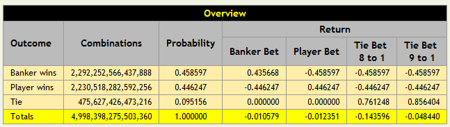 تُظهر جداول العائد التالية النتائج المحتملة لرهانات اللاعب والمصرفي والتعادل في لعبة من 8 مجموعات أوراق. وكما هو موضح في الخلايا أسفل يمين كل جدول، تبلغ نسبة ربح الكازينو 1.06% لرهان المصرفي، و1.24% لرهان اللاعب، و14.36% لرهان التعادل.