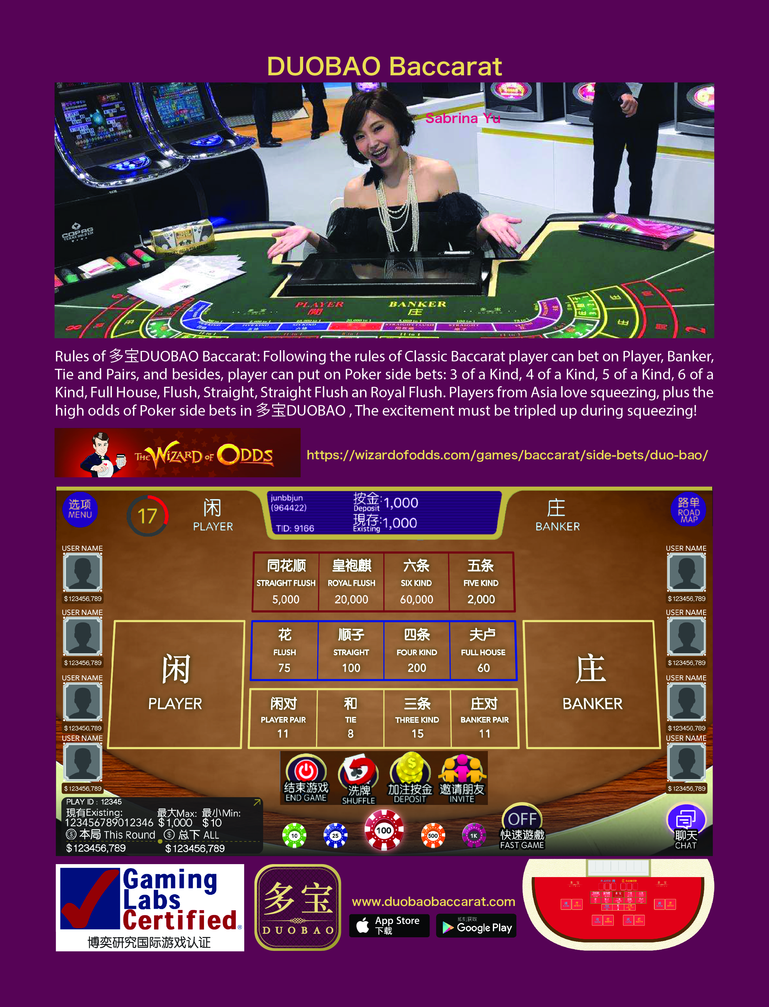 إذا كانت لغتي الصينية صحيحة، فإن "دو باو" تعني "كنوز كثيرة". إنها لعبة باكارات ذات رهانات جانبية متعددة مستوحاة من البوكر. ولأن قواعد الباكارات مطابقة لقواعد الباكارات التقليدية، فسأصنف هذه اللعبة كمجموعة من رهانات الباكارات الجانبية.