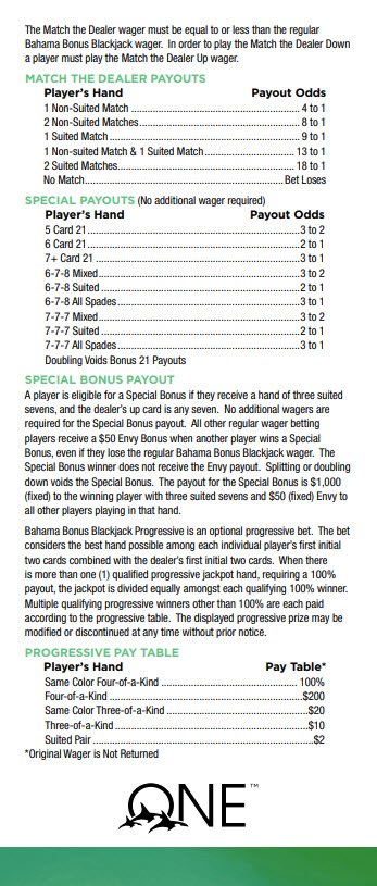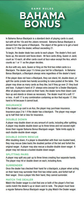 بلاك جاك باهاما بونوس هو نوع من البلاك جاك لاحظته في كازينو 7 سيدارز بالقرب من سيكويم، واشنطن، في 28 يوليو 2021. وبالبحث، وجدت أنه متوفر أيضًا في كازينو تولاليب بواشنطن. إنها ببساطة لعبة مقلدة للعبة 21 الإسبانية .