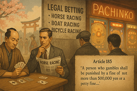 الجانب القانوني للمقامرة في اليابان صارم. يحظر القانون الجنائي جميع أشكال المراهنة المالية تقريبًا ، مع استثناءات قليلة مثل سباقات الخيل، وبعض رياضات السيارات، واليانصيب الوطني.