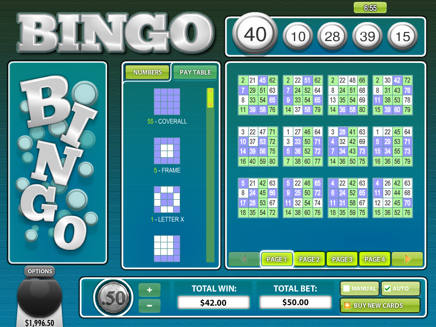 حدث سحب الكرة رقم 35 سحب الكرة 45 سحب الكرة رقم 55 بدلة 10,000 1200 55 إطار 1000 400 5 إكس 15 2 1 خطين 15 2 1 خط واحد 2 1 1 قطري واحد 2 1 1 أربع زوايا 1 1 1 - الفوز في خط واحد وخطين يكون فقط في الخطوط الأفقية والرأسية. ما يُسمى "بالطريقة الصعبة" في صالات بنغو فيغاس. للفوز في خطين، يجب أن يكون أحدهما عموديًا والآخر أفقيًا. هذه القاعدة غير مذكورة في قواعد اللعبة. كدليل، أقدم لقطة الشاشة التالية لبطاقة مُغطاة بخطين أفقيين، ولكن تم إبراز الفوز في صف واحد فقط.