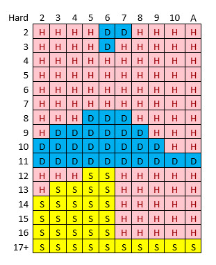 بخلاف ذلك، مع أي مجموع صعب، يجب على اللاعب اتباع جدول الاستراتيجية الأساسية التالي.