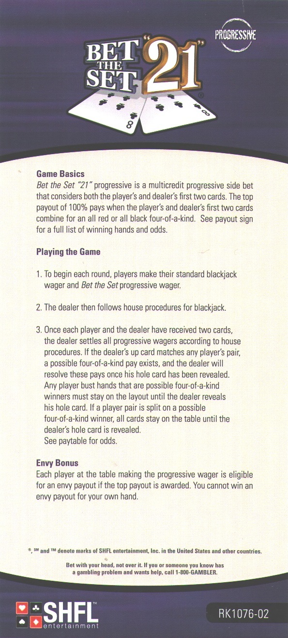 لاحظتُ هذا النوع من لعبة "راهن على المجموعة" في 19 أبريل 2013 في كازينو ريد روك بلاس فيغاس. كان توزيعها من لعبة بستة رزم. يفوز الرهان إذا كان لدى اللاعب زوج من ورقتيه الأوليين، ويزداد إذا كانتا متطابقتين. على عكس لعبة "راهن على المجموعة" التقليدية، إذا كان لدى اللاعب زوج، فلديه فرصة للفوز بجوائز كبيرة إذا كان لدى الموزع زوج من نفس الرتبة.