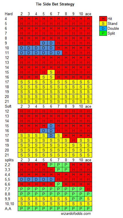 يوضح الجدول التالي الاستراتيجية الأساسية الصحيحة بافتراض لعب الحد الأقصى للرهان الجانبي والقواعد المذكورة أعلاه.