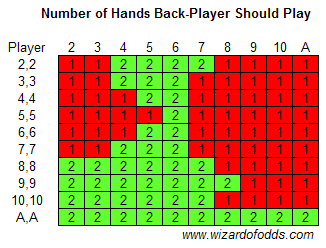 يوضح الجدول الأول أدناه عدد الأوراق التي يجب على اللاعب الخلفي اختيارها. يعتمد هذا الجدول على عدد لا نهائي من الأوراق، وهو نفسه بغض النظر عما إذا كان الموزع قد ضرب أو توقف عند ورقة ١٧ ناعمة. يفترض الجدول أن المضاعفة بعد التقسيم مسموح بها. كما يتضمن تقسيمات خاطئة بشكل واضح، والتي أُدرجت لغرض الاكتمال، وليس للإشارة إلى أن اللاعب المسيطر يجب أن يقسم أوراقه. يفترض الجدول أيضًا أن اللاعب الأمامي سيستمر في إعادة التقسيم، حتى لو كانت لعبة سيئة.