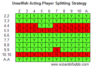 الجدول التالي يُشير إلى لاعب غير أناني، يُقسّم أوراقه أو لا يُقسّمها وفقًا لمصلحة اللاعب المُتأخّر. قد يحدث هذا إذا كان اللاعبان مُتواطئين، وكان رهانهما المُتأخّر أكبر بكثير من رهان اللاعب المُتأخّر. يُبيّن الجدول متى يجب على اللاعب المُتأخّر التقسيم، بافتراض السماح بالضعف بعد التقسيم، ووجود عدد لا نهائي من رزم الورق. لا يُهمّ ما إذا كان الموزع يُعطي أو يُبقي على رهانه عند وجود ورقة ١٧ ناعمة.
