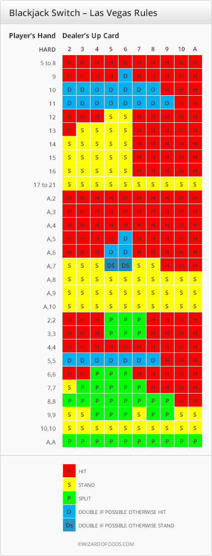 توضح الجداول التالية الاستراتيجية الأساسية وفقًا لقواعد لعبة لاس فيغاس ذات الثمانية أوراق بعد اتخاذ قرار التبديل. ويعود سبب اختلافها عن استراتيجية البلاك جاك التقليدية إلى قاعدة "الدفع عند ٢٢".