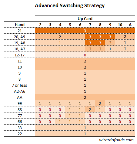 فيما يلي "استراتيجية سيندي ليو المتقدمة للتبديل"، وهي مناسبة لقواعد لاس فيغاس. لاستخدامها، اجمع نقاط كل يد في كلا طريقتي اللعب، ثم العب بالتي بها عدد أكبر من النقاط. في حالة التعادل، استخدم الاستراتيجية البسيطة.