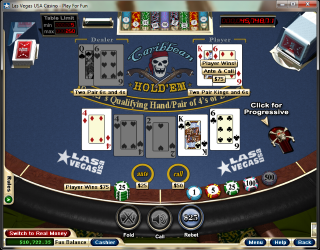 لعبة كاريبيان هولدم تُشبه لعبة كازينو هولدم ، باستثناء أن رهان "أنتي" يُدفع مبلغًا متساويًا فقط إذا لم يستوفِ الموزع الشروط. كما يُضيف رهانًا جانبيًا على جائزة كبرى تصاعدية. يُمكن لعب هذه النسخة فقط في كازينوهات الإنترنت التي تستخدم برنامج Realtime Gaming .