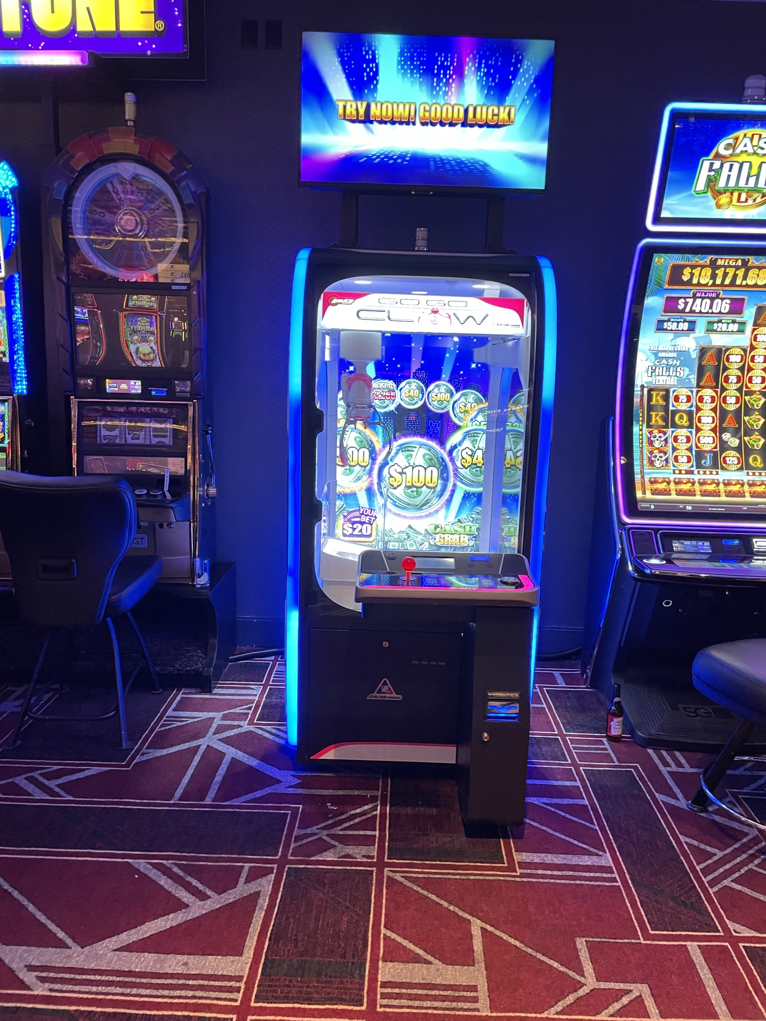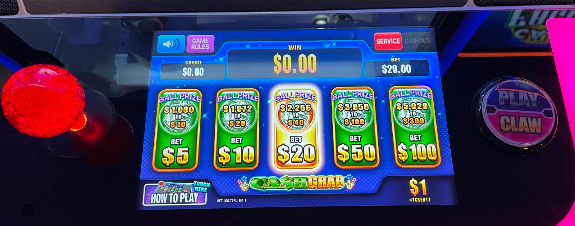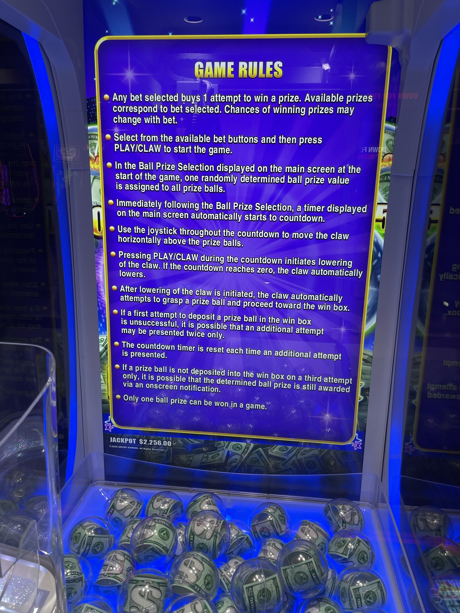 - يُحدَّد الفوز عشوائيًا بواسطة جهاز كمبيوتر. أزرار عصا التحكم و"الإمساك" للعرض فقط. ستلتقط اللعبة الكرة في البداية دائمًا. إذا كان اللاعب مقدرًا له الخسارة، وهو ما يحدث عادةً، فسيُسقط المخلب الكرة قبل وصولها إلى المزلق. أما إذا كان مقدرًا له الفوز، فسيُسقط المخلب الكرة في المزلق، وسيُكشف عن الفوز رقميًا على الشاشة. ثم تُعاد الكرة غير المفتوحة إلى مجموعة الكرات في الأسفل.