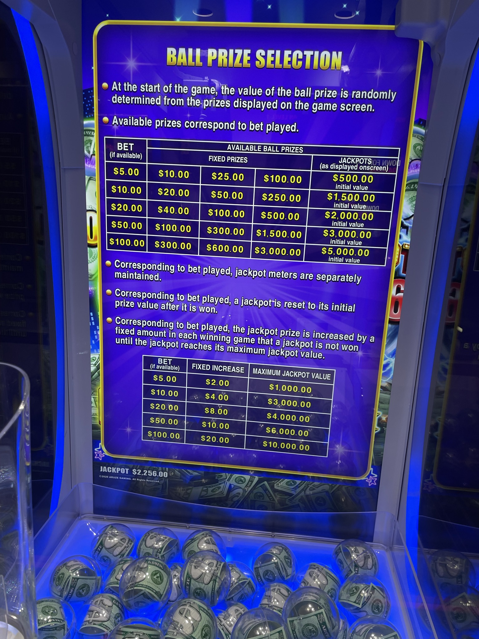 - لكل مبلغ رهان جائزته الكبرى الخاصة. تُظهر القائمة التالية قيمة إعادة الضبط والحد الأقصى للقيم الخمس: