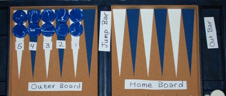 - تُحرَّك كل قطعة بمقدار النقاط المقابلة لرمية النردين. على سبيل المثال، إذا رمى الرامي النردين ٤ و٥، فستتحرك إحدى القطعتين ٤ نقاط والأخرى ٥ نقاط.
