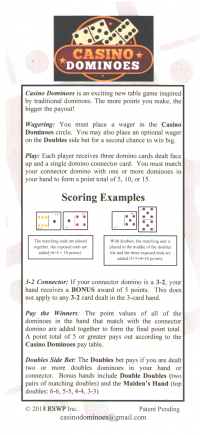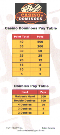 كازينو دومينو هي أول لعبة كازينو أشاهدها تُلعب باستخدام الدومينو، إن لم تكن باي غاو . سمعت عنها لأول مرة في معرض ألعاب الطاولة "كاتينغ إيدج" لعام ٢٠١٧، حيث صنعتُ هذا الفيديو مع مُنشئ اللعبة. تُلعب اللعبة باستخدام تمثيلات الدومينو على أوراق اللعب. تُتيح رهانين ولا تتطلب أي مهارة. بدأت كتجربة ميدانية في فندق بلازا بلاس فيغاس في ١٨ سبتمبر ٢٠١٨. زرتها بعد يومين.
