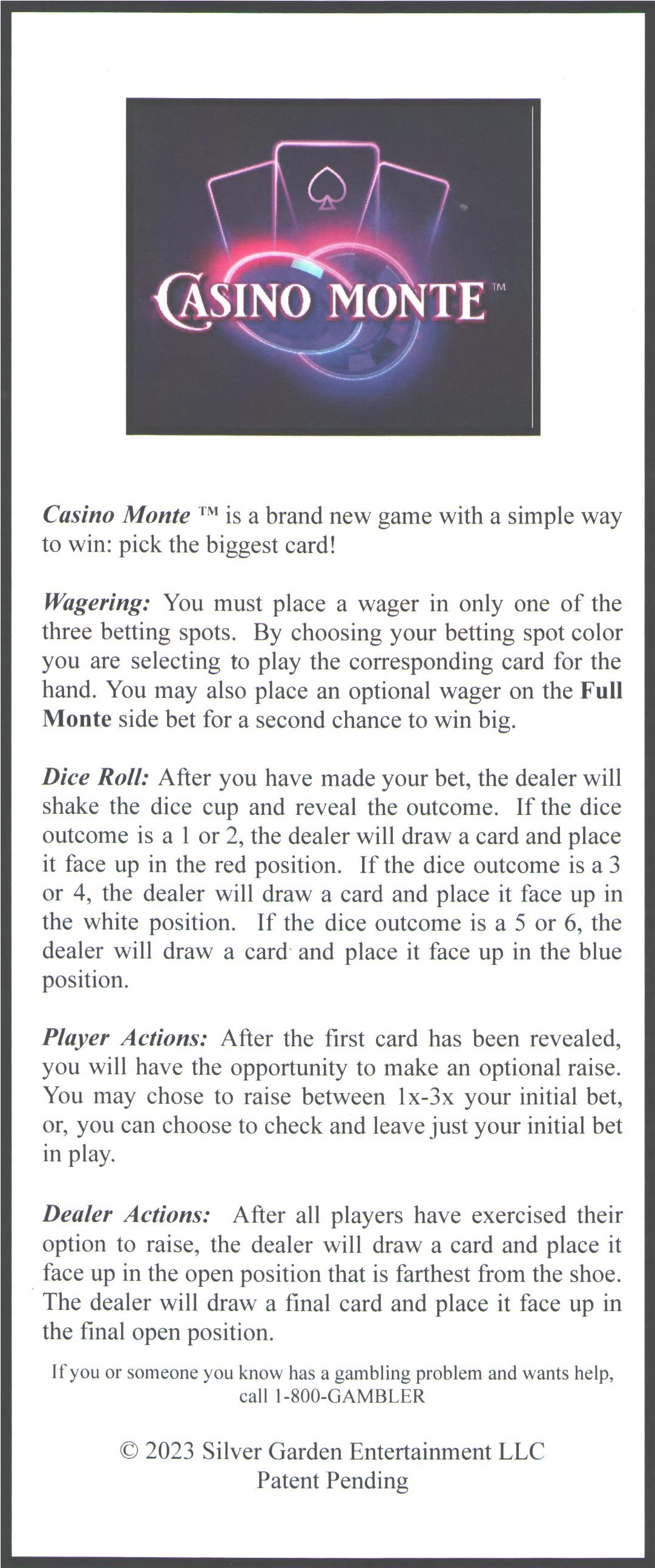 كازينو مونتي لعبة كازينو بسيطة بثلاث أوراق. يفوز اللاعب إذا توقع المركز الذي سيحتوي على أعلى عدد من الأوراق. يفوز المتعادلون، وهناك فرصة لزيادة الرهان بعد الكشف عن إحدى الورقتين.
