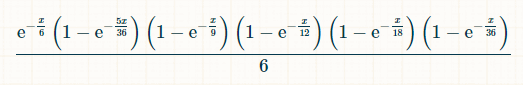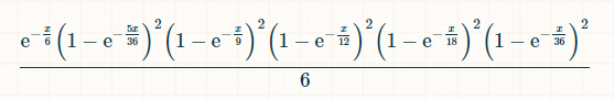 بما أن الفوز بالرقم 7 ممكن في أي وقت، فإن احتمال الفوز هو تكامل هذا الاحتمال على x من 0 إلى ما لا نهاية. ليس من الضروري أن نعرف، ولكن التكامل قبل وضع حدود التكامل هو (-6*e^(-x/6)+(72*e^(-(7*x)/36))/7+(9*e^(-(2*x)/9))/2-8*e^(-x/4)-(18*e^(-(5*x)/18))/5-(72*e^(-(11*x)/36))/11+(72*e^(-(13*x)/36))/13+(108*e^(-(7*x)/1 8))/7+(24*e^(-(5*x)/12))/5-(27*e^(-(4*x)/9))/4-(216*e^(-(17*x)/36))/17-10* ه^(-x/2)-(72*e^(-(19*x)/36))/19+(27*e^(-(5*x)/9))/5+(144*e^(-(7*x)/12))/7+ (54*e^(-(11*x)/18))/11-(72*e^(-(23*x)/36))/23-(15*e^(-(2*x)/3))/2-(216*e^( -(25*x)/36))/25-(54*e^(-(13*x)/18))/13+(8*e^(-(3*x)/4))/3+(54*e^(-(7*x)/9) )/7+(72*e^(-(29*x)/36))/29-(72*e^(-(31*x)/36))/31-(9*e^(-(8*x)/9))/8-(24*e) ^(-(11*x)/12))/11+(18*e^(-(17*x)/18))/17+(72*e^(-(35*x)/36))/35-e^(-x))/6.