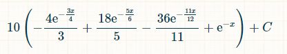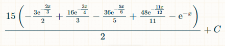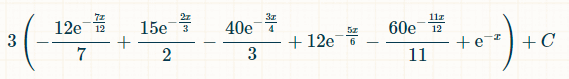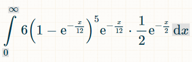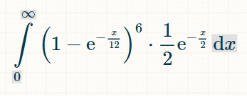 لدمج ذلك، أنصح باستخدام حاسبة التكامل هذه. في حقل التكامل، اكتب "(1-exp(-x/12))^6*(1/2)*exp(-x/2)." لحدود التكامل، ضمن الخيارات، ضع 0 و∞. ثم انقر على "انتقال"."سيعطيك التكامل أدناه: