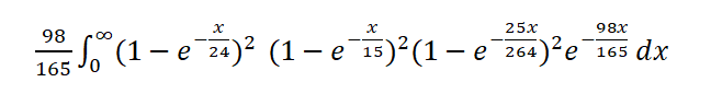 سيكون دمج هذا يدويًا مُرهقًا جدًا وعرضةً للأخطاء. لحسن الحظ، توجد آلات حاسبة للتكامل . لاستخدام الآلة الحاسبة في هذه المسألة، انقر على الرابط، ثم اكتب ما يلي في مربع النص بالأعلى: (1-exp(-x/24))^2*(1-exp(-x/15))^2*(1-exp(-25x/264))^2*exp(-98x/165)/(165/98). ثم انقر على الخيارات، واضبط الحد الأدنى على 0 والحد الأقصى على ما لا نهاية. ثم انقر على "انتقال".