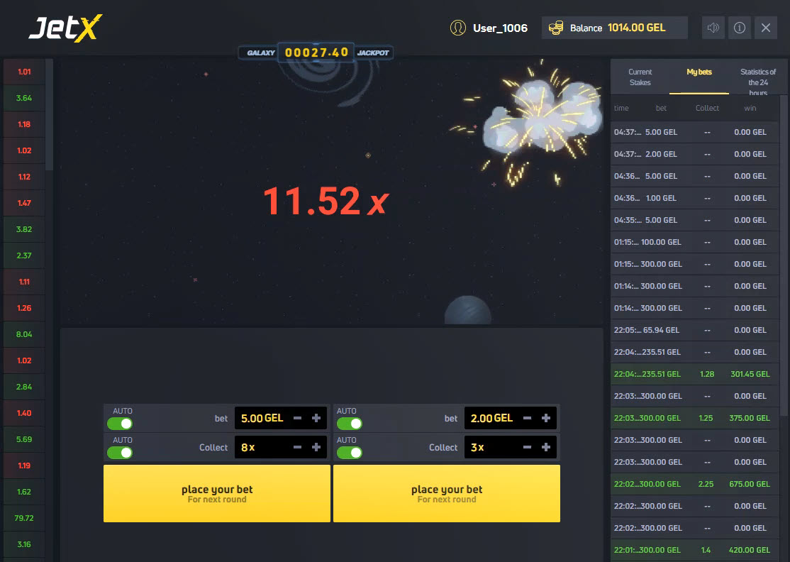 ليس أن الأمر مهم، لكن المركبة الفضائية استمرت في الصعود حتى انفجرت، وهو ما حدث في هذه الحالة بمضاعف 11.52x. لاحظ أيضًا رصيدي البالغ 1014 لاري جورجي. للتذكير، بعد وضع الرهانات، كان رصيدي 968. ربح الرهان الأيسر 5 × 8 = 40. ربح الرهان الأيمن 2 × 3 = 6. كان إجمالي ربحي 40 + 6 = 46. رصيدي الجديد هو 968 + 46 = 1014.