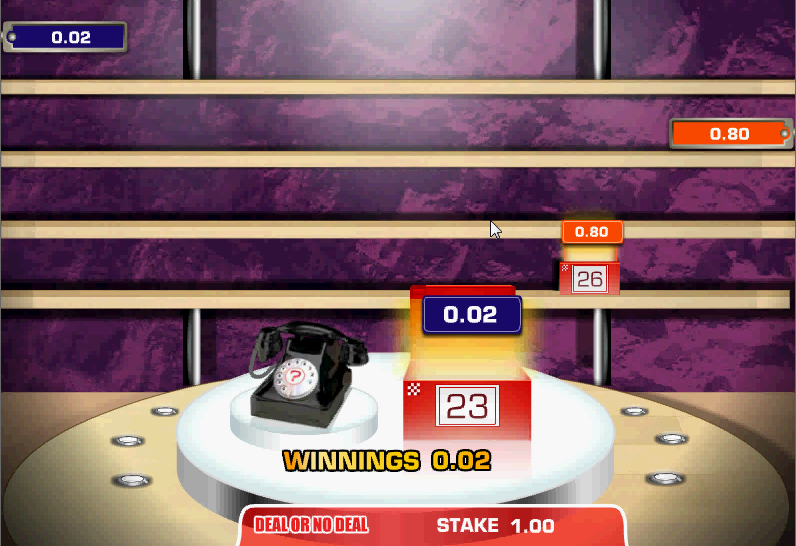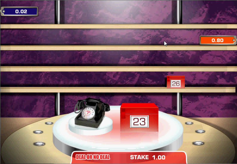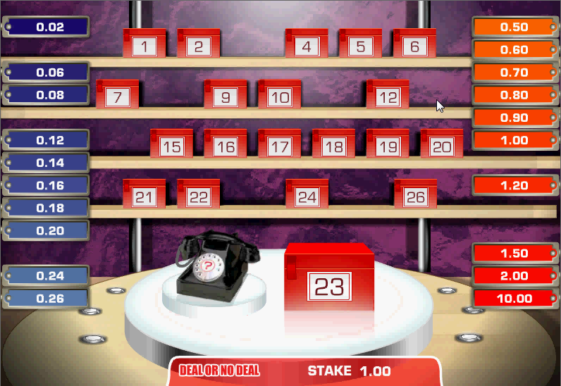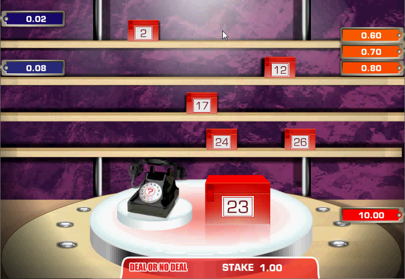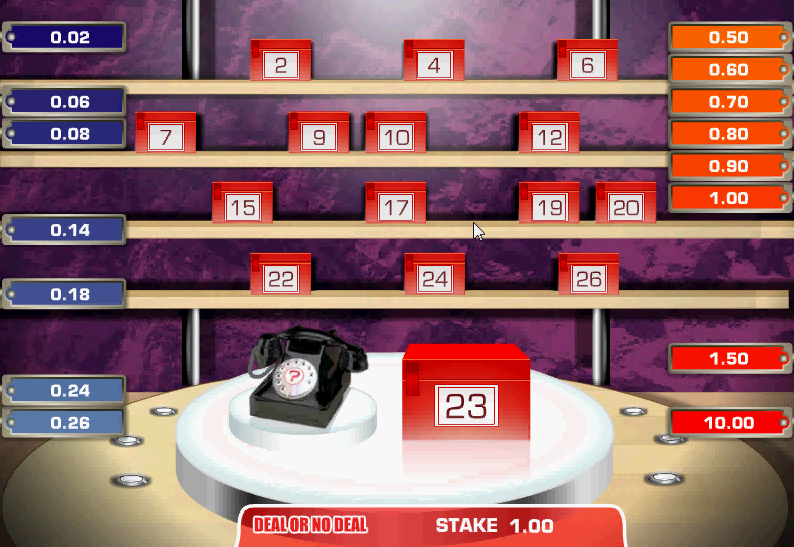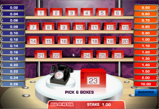 - تتكون اللعبة من ٢٦ جائزة موزعة عشوائيًا في ٢٦ صندوقًا. قيمة الجائزة هي حاصل ضرب رهان اللاعب، وهي: ٠.٠٢ دولار أمريكي، ٠.٠٤ دولار أمريكي، ٠.٠٦ دولار أمريكي، ٠.٠٨ دولار أمريكي، ٠.١٠ دولار أمريكي، ٠.١٢ دولار أمريكي، ٠.١٤ دولار أمريكي، ٠.١٦ دولار أمريكي، ٠.١٨ دولار أمريكي، ٠.٢٠ دولار أمريكي، ٠.٢٢ دولار أمريكي، ٠.٢٤ دولار أمريكي، ٠.٢٦ دولار أمريكي، ٠.٥٠ دولار أمريكي، ٠.٦٠ دولار أمريكي، ٠.٧٠ دولار أمريكي، ٠.٨٠ دولار أمريكي، ٠.٩٠ دولار أمريكي، ١.٠٠ دولار أمريكي، ١.١٠ دولار أمريكي، ١.٢٠ دولار أمريكي، ١.٣٠ دولار أمريكي، ١.٤٠ دولار أمريكي، ١.٥٠ دولار أمريكي، ٢.٠٠ دولار أمريكي، و١٠.٠٠ دولار أمريكي.