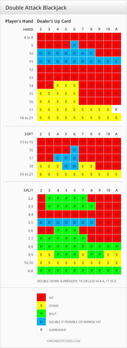فيما يلي الاستراتيجية الأساسية للعبة بلاك جاك الهجوم المزدوج. "الاستسلام بعد مضاعفة الرهان" يشير إلى وقت الاستسلام بعد مضاعفة الرهان.