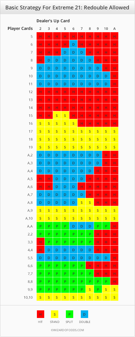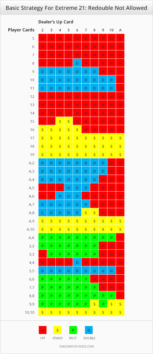 يوضح الجدول التالي الإستراتيجية الأساسية للعبة Extreme 21 إذا تم السماح بالمضاعفة.