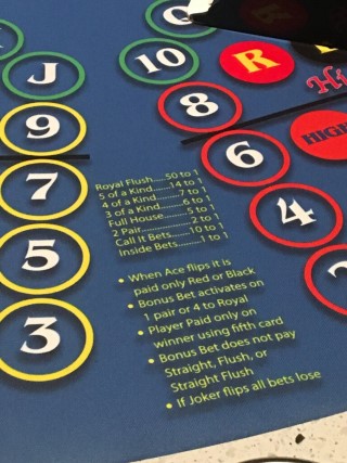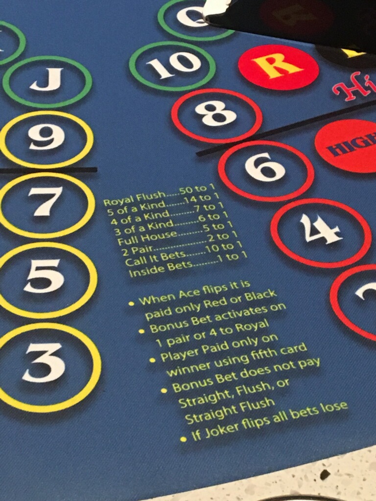 *: قبل 20 سبتمبر 2018، كان الآس يُسبب خسارة الرهانات المنخفضة والعالية والفردية والزوجية. في ذلك التاريخ، تم تغيير الآس إلى سحب لتلك الرهانات.