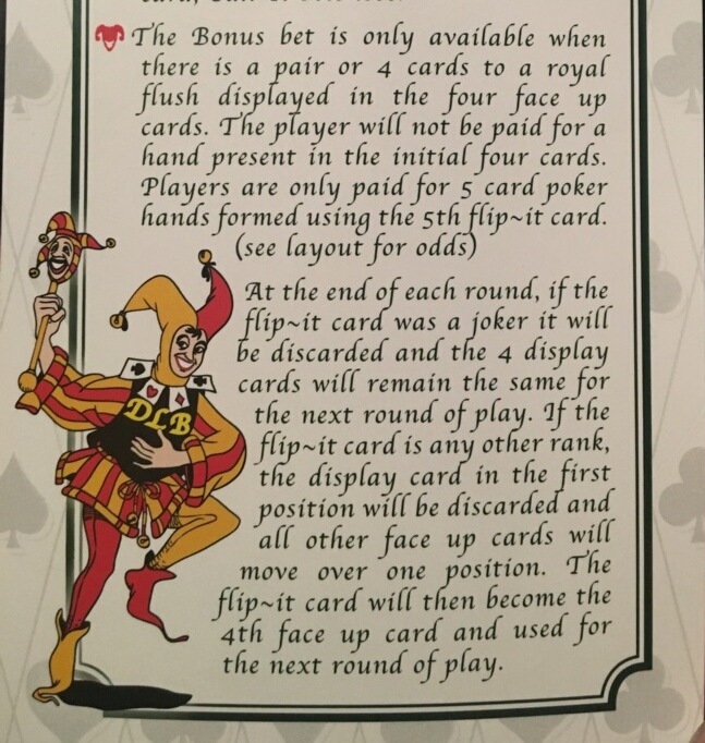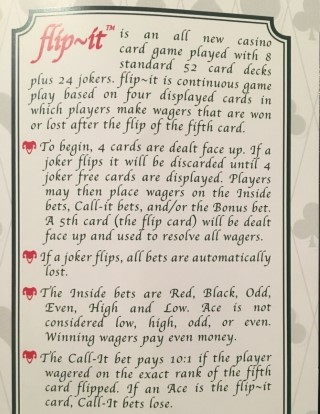 - بعد إغلاق الرهان، تُوزّع بطاقة "Flip-It" الخامسة مكشوفة لحسم جميع الرهانات. إذا كانت هذه البطاقة الخامسة جوكر، تُخسر جميع الرهانات.