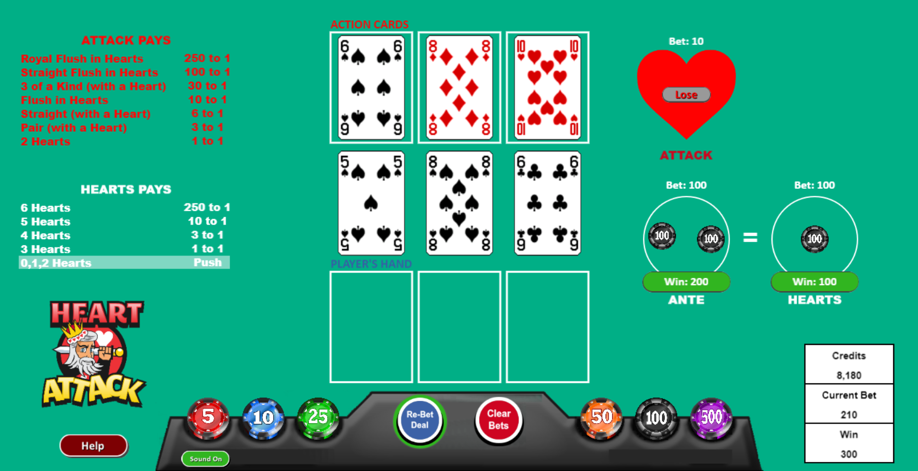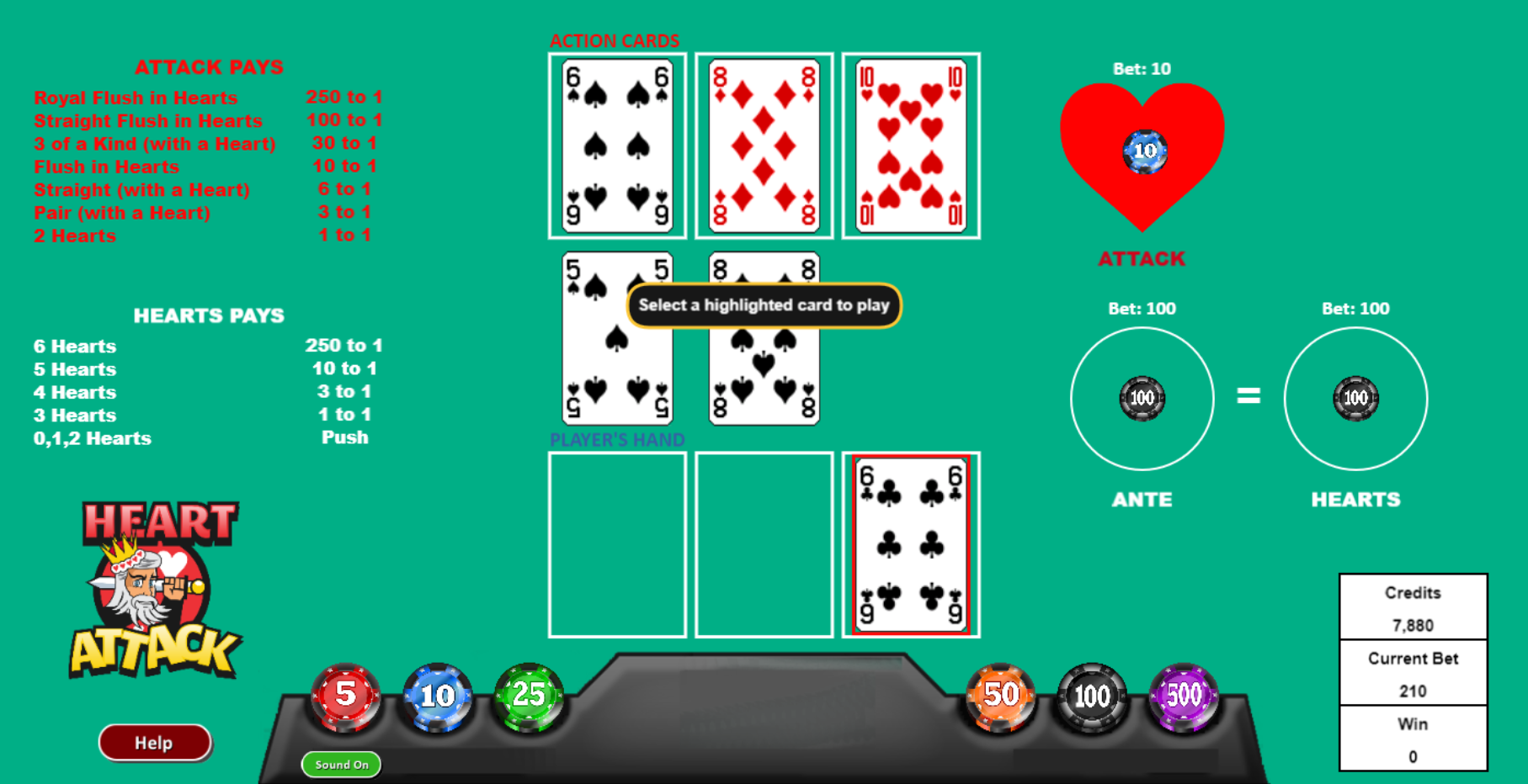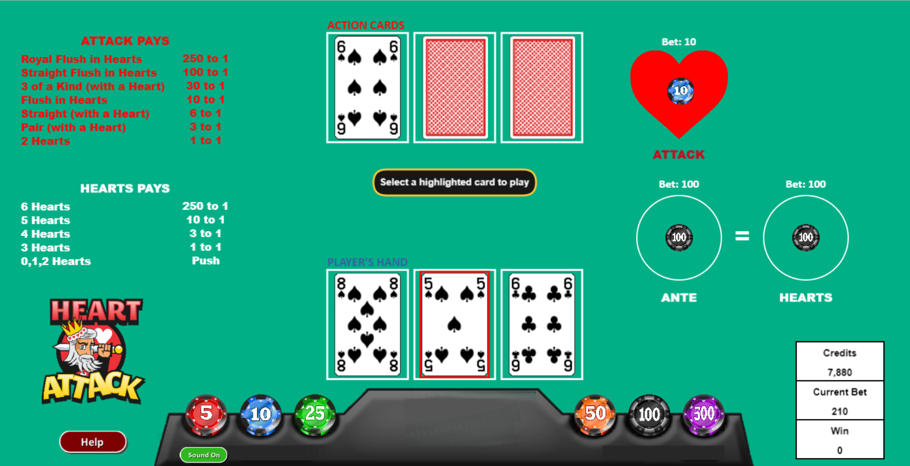 فيما يلي مثال للعبة تم لعبها من خلال النسخة التجريبية المجانية . في الصورة الأولى، يمكنك أن ترى أنني راهنت بمبلغ 100 دولار على رهان "الرهان الأولي" و"القلوب" و10 دولارات على رهان "الهجوم". هذه حالة نادرة حيث تمكنت من لعب جميع البطاقات الثلاث دون قلب، لأن جميعها تتطابق مع أول بطاقة لدى الموزع، سواءً من حيث الرتبة أو النوع.