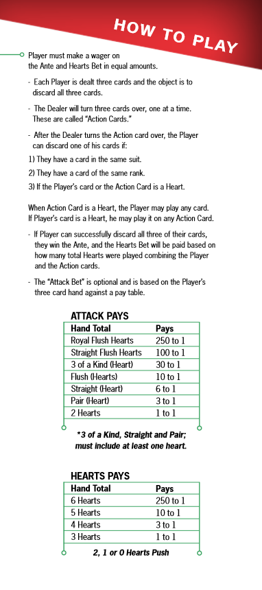 - إذا نجح اللاعب في التخلص من جميع البطاقات الثلاث، فسيتم دفع رهان "أنتي" بالتساوي، ويتم احتساب رهان "القلوب" بناءً على مجموع عدد بطاقات "القلوب" بين يدي اللاعب والموزع، كما يلي. تُحسب الأرباح على أساس "واحد إلى واحد".