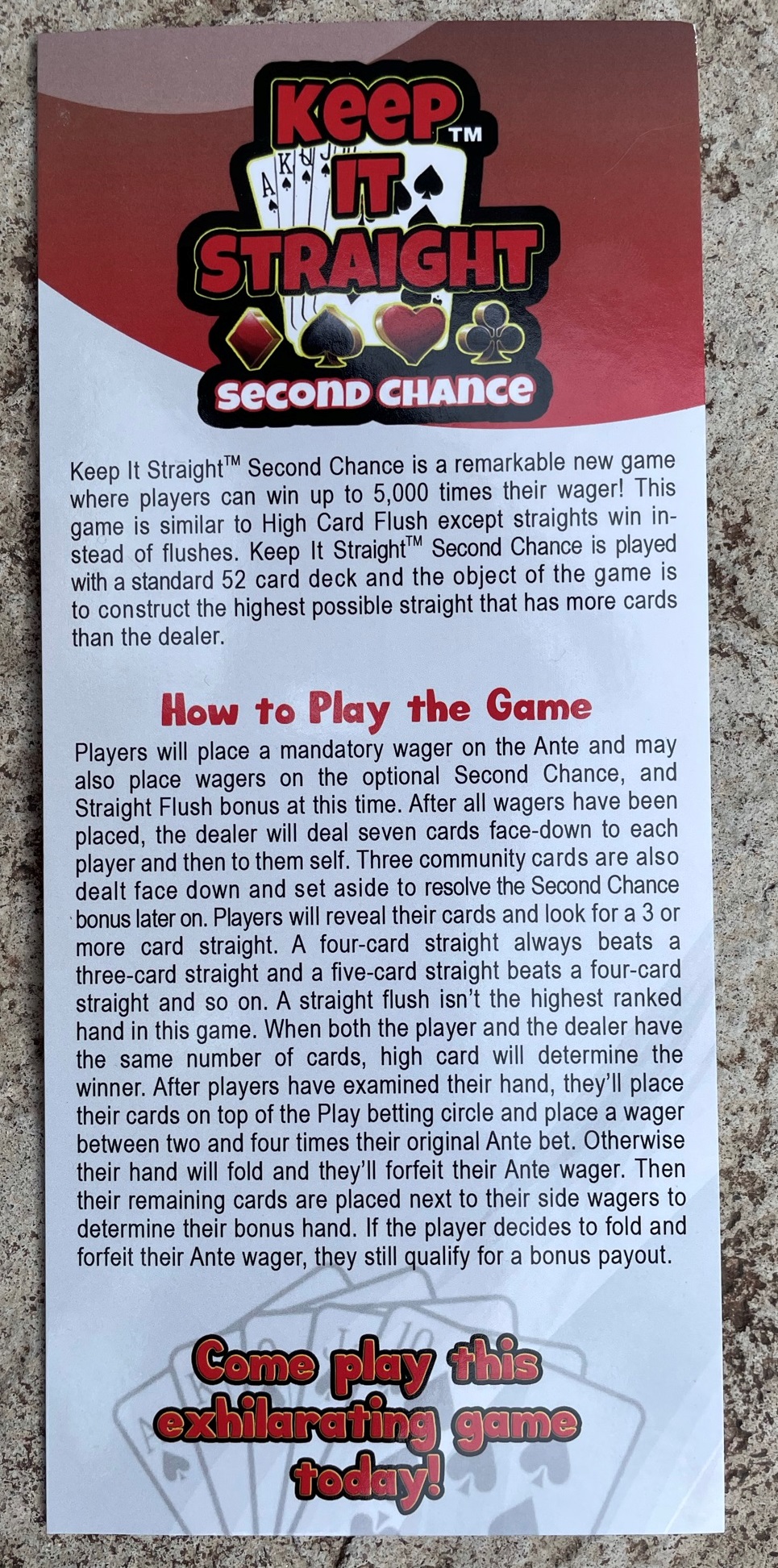 Keep it Straight Second Chance هي لعبة بوكر من إنتاج Creative Dream Gaming, LLC. يُمكن مقارنتها بسهولة بلعبة High Card Flush ، إلا أن الهدف هو الحصول على ستريت أطول من الموزع. شاهدتُ اللعبة لأول مرة في ١٦ نوفمبر ٢٠٢١ في فلامنغو لاس فيغاس أثناء تجربتها الميدانية.