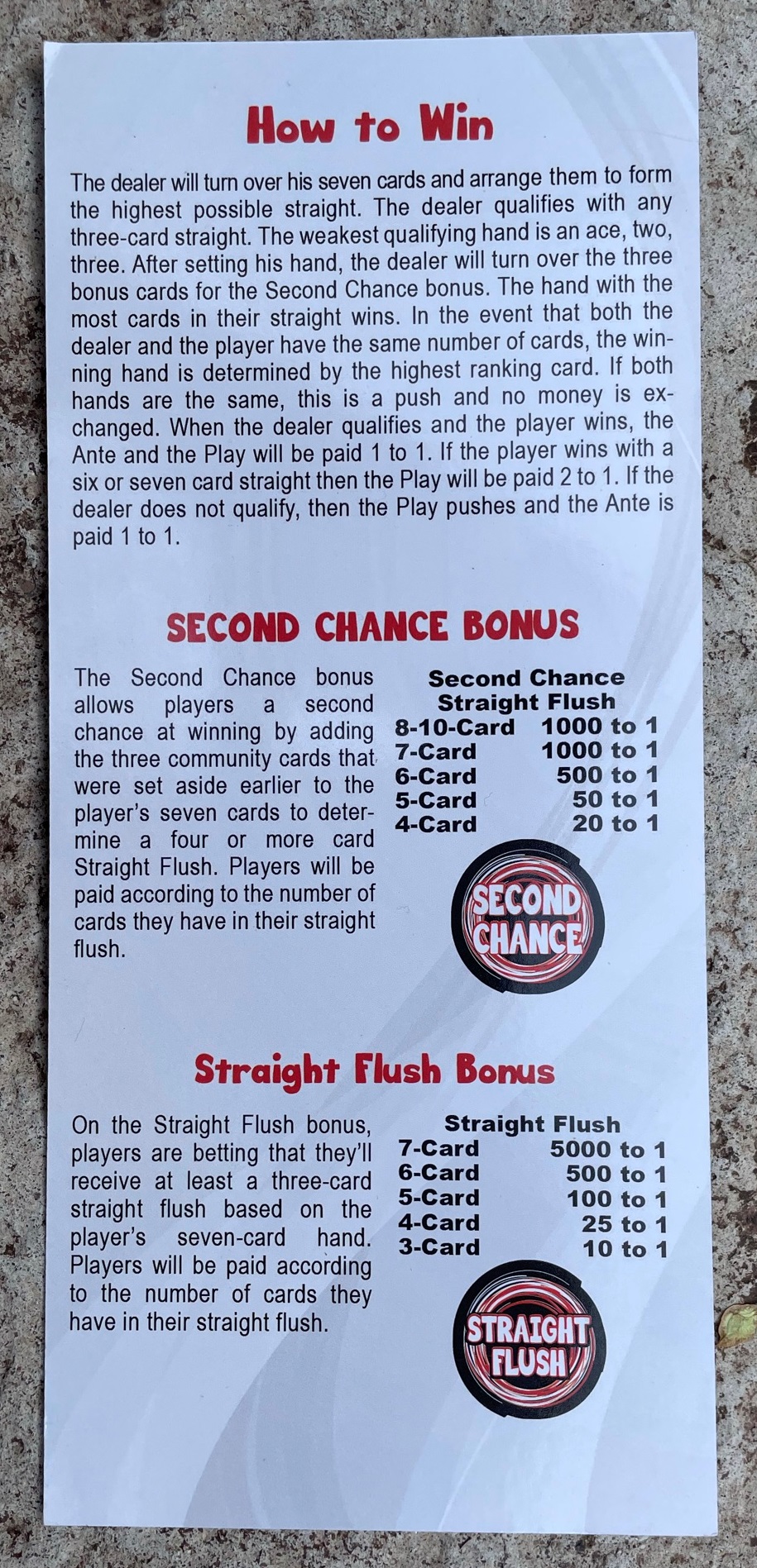 - سيتم دفع مكافأة الفرصة الثانية بناءً على أطول خط مستقيم بين بطاقات اللاعب السبعة والبطاقات المجتمعية الثلاث، وفقًا لجدول الدفع أدناه.