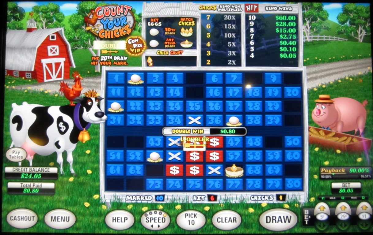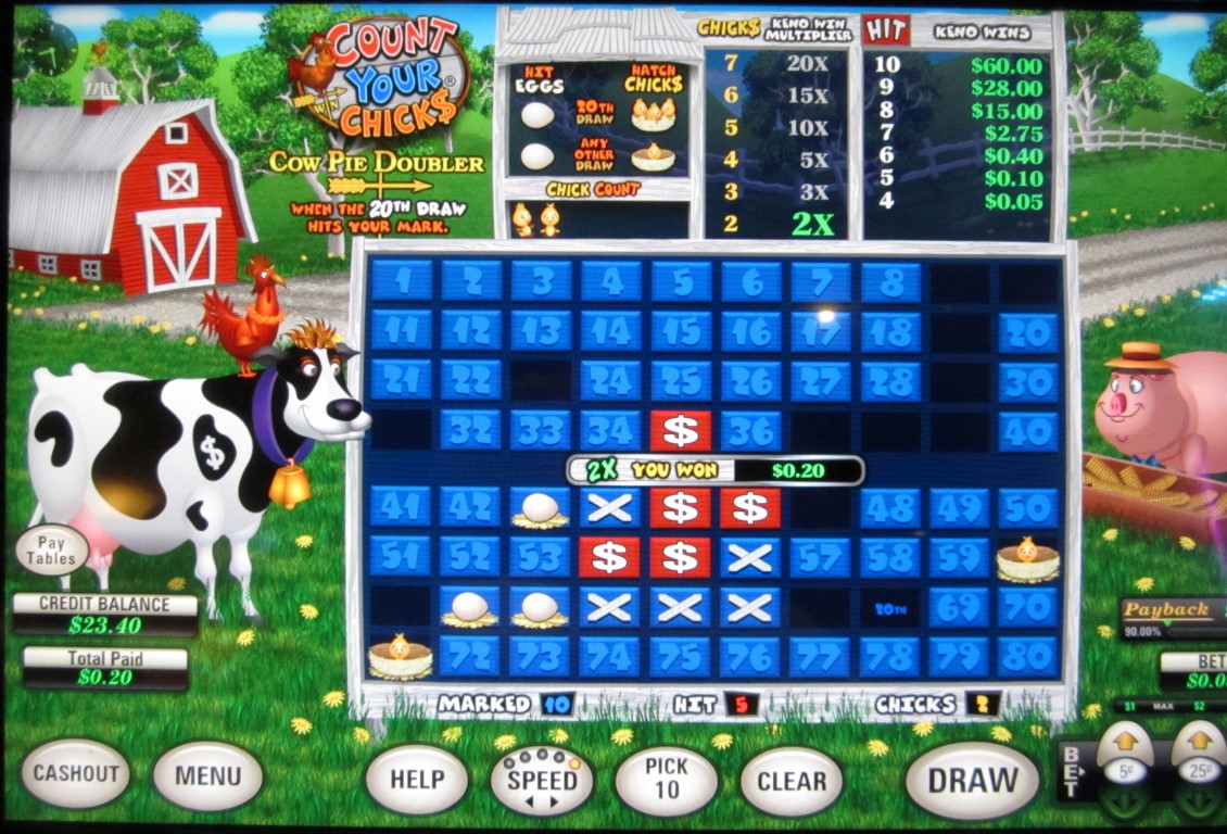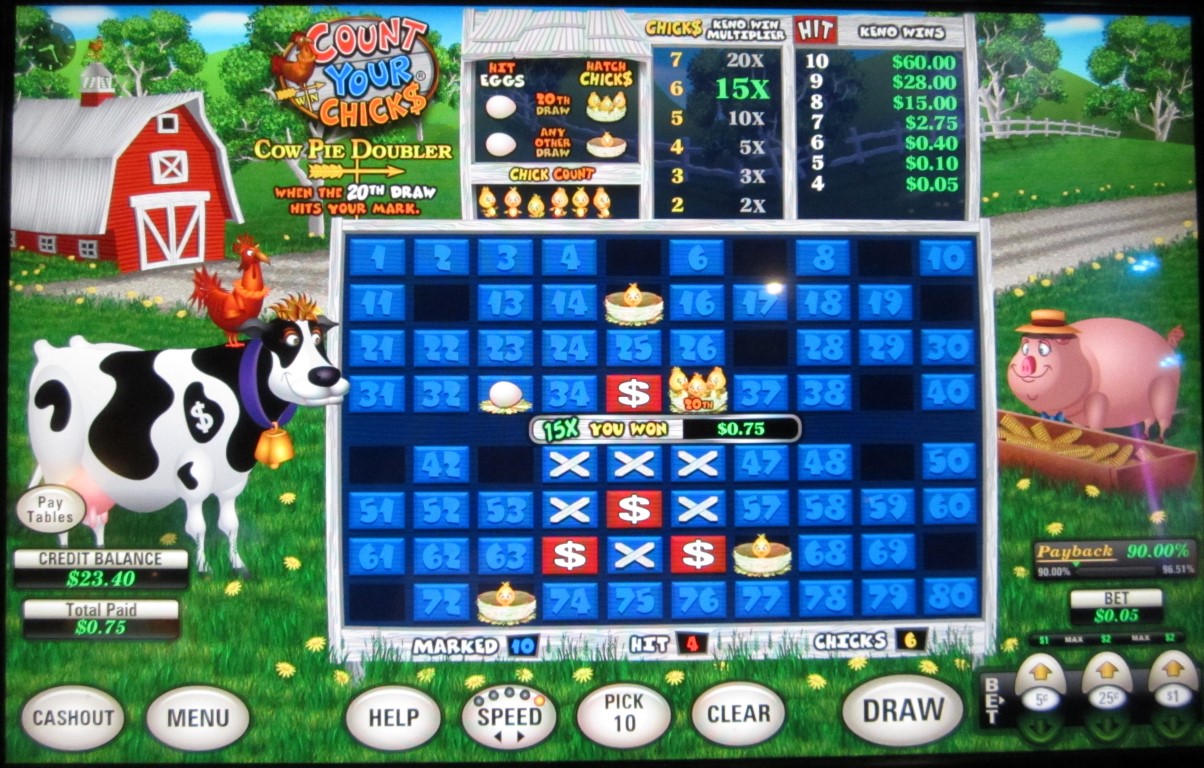 "احسب فراخك" لعبة تعتمد على الكينو، متوفرة على ماكينات متعددة الألعاب من إنتاج شركة U1 Gaming . رأيتُ مثل هذه الماكينات في كازينوهات لاس فيغاس كلوب، ورامبارت، ودوتي في لاس فيغاس. تعتمد لعبة "احسب فراخك" على وضع بيضة عشوائيًا على خمسة أرقام لم يختارها اللاعب. إذا تطابقت نتيجة سحب الكرات العشرين مع أيٍّ منها، تفقس البيضات وتتحول إلى فراخ. يربح اللاعب مضاعفًا عن كل فرخين أو أكثر يفقسان. تُطبق قواعد خاصة على الكرة العشرين.