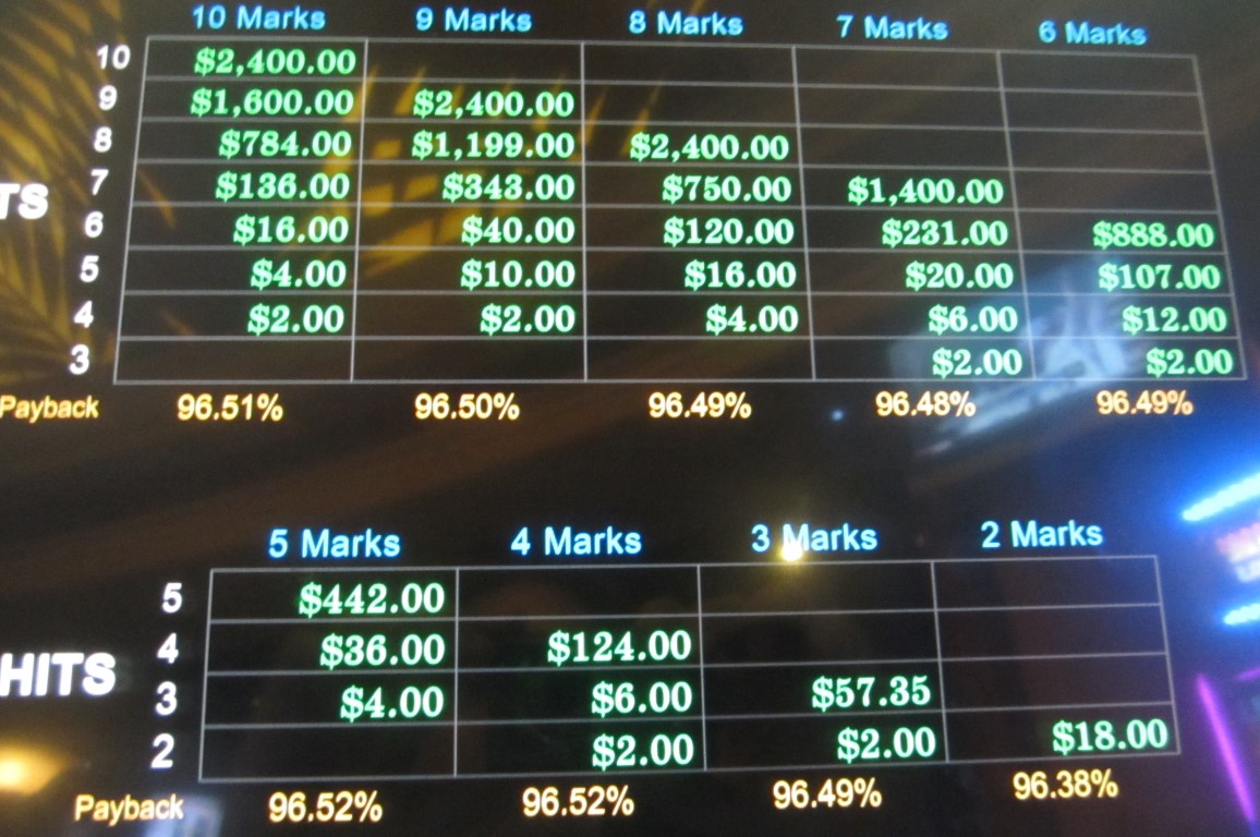في المثال الأول، راهنتُ بخمسة سنتات واخترتُ عشرة أرقام. فزتُ بخمسة منها، وكان ربحي الأساسي ١٠ سنتات. بالإضافة إلى ذلك، فقس فرخان من البيض الموضوع على الرقمين ٦٠ و٧١، بمضاعف ٢x. بعد حساب المضاعف، كان ربحي النهائي ١٠ سنتات × ٢ = ٢٠ سنتًا.