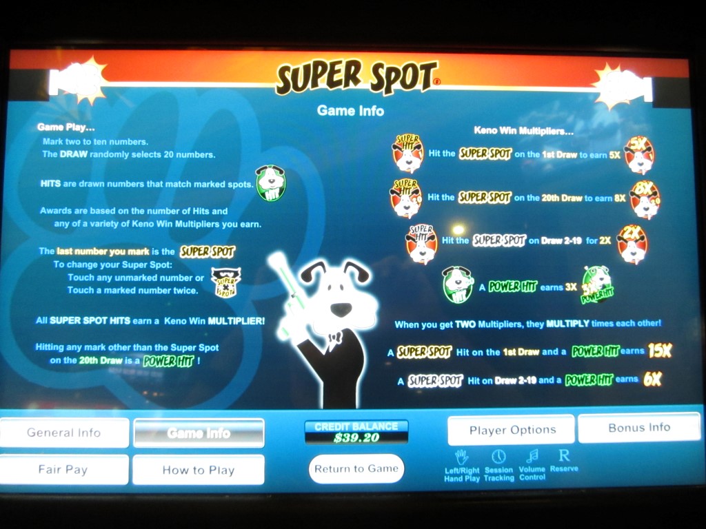 سوبر سبوت لعبة تعتمد على الكينو، متوفرة على ماكينات متعددة الألعاب من إنتاج شركة U1 Gaming. رأيتُ مثل هذه الماكينات في كازينوهات Las Vegas Club وRampart وDotty's في لاس فيغاس. سوبر سبوت شبيهة بـ Power Keno ، باستثناء وجود مضاعفين محتملين: أحدهما لضرب آخر رقم مُختار، والآخر لضرب أي شيء في الكرة الأخيرة.