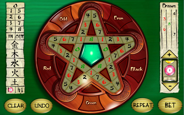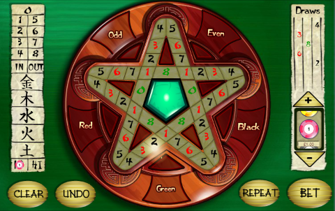 - المعدن، الخشب، الماء، النار، التربة: هذه هي الرموز الصينية الخمسة. يغطي كلٌّ منها خطًا واحدًا من النجمة الخماسية. تذكر أن نقطتين من هذه الرموز تقعان على تقاطعات، لذا فهي ذات وزن مزدوج. وبالتالي، يكون مجموع نقاط الفوز لكل منها 2 × 2 + 7 = 11.