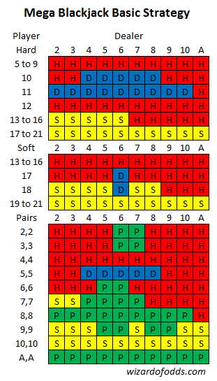 يوضح الجدول التالي الاستراتيجية الأساسية للعبة Mega Blackjack.