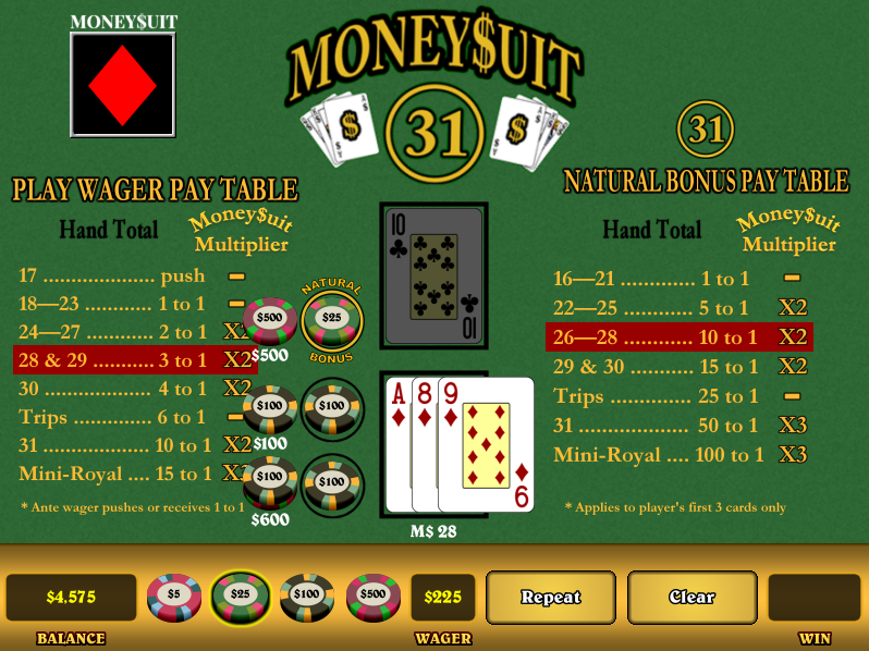 لعبة Money$suit 31 هي لعبة طاولة جديدة طُرحت لأول مرة في منتجع وكازينو لاك فيو ديزرت في ووترسميت، ميشيغان، في يناير 2015. يصعب مقارنتها بأي ألعاب أخرى، إذ يتمثل هدفها في جمع نقاط عدة أوراق من نفس النوع للحصول على يد مجموع نقاطها 17 نقطة أو أكثر. تتميز اللعبة بقيم أوراق البلاك جاك وقرار رفع/طي الرهان، كما هو الحال في العديد من ألعاب البوكر. تُعدّ أنواع الأوراق مهمة، ويتم تحديد مجموعة Money$suit خاصة برمي نردين مخصصين.