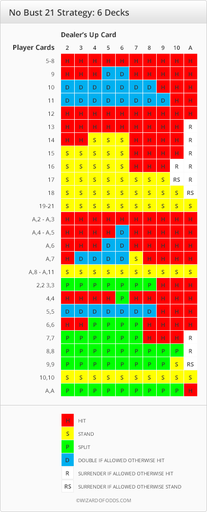 يوضح الجدول التالي كيفية لعب أي يد، بناءً على لعبة بستة مجموعات أوراق. تظهر يد اللاعب على طول العمود الأيسر، بينما تظهر ورقة الموزع المكشوفة على طول الصف العلوي.