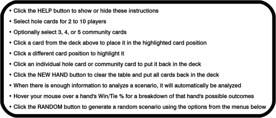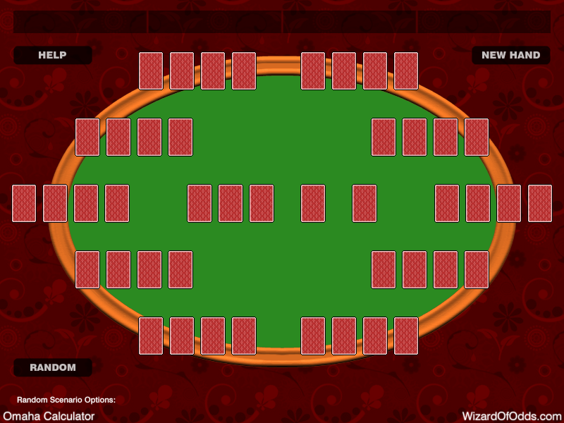 ستمنحك حاسبة البوكر هذه احتمالات الفوز والخسارة والتعادل لكل لاعب في لعبة أوماها أو أوماها هاي/لو 8 أو أفضل. انقر على أي بطاقة وسيتم استخدامها في الموضع المحدد بالإطار الأصفر. يمكنك النقر على أي بطاقة صالحة لتحريك الإطار إلى هناك. حدد "يد مطوية" للإشارة إلى أن اللاعب المعني خارج اللعبة، مما يؤدي إلى إزالة أوراقه من المجموعة المتبقية. يمكنك أيضًا ضبط أي موقف عشوائي. يُرجى الانتظار لبضع ثوانٍ لحساب كل سيناريو، وخاصةً هاي/لو، لأن حساب أوماها يستغرق وقتًا أطول من حساب تكساس هولدم. استمتع!