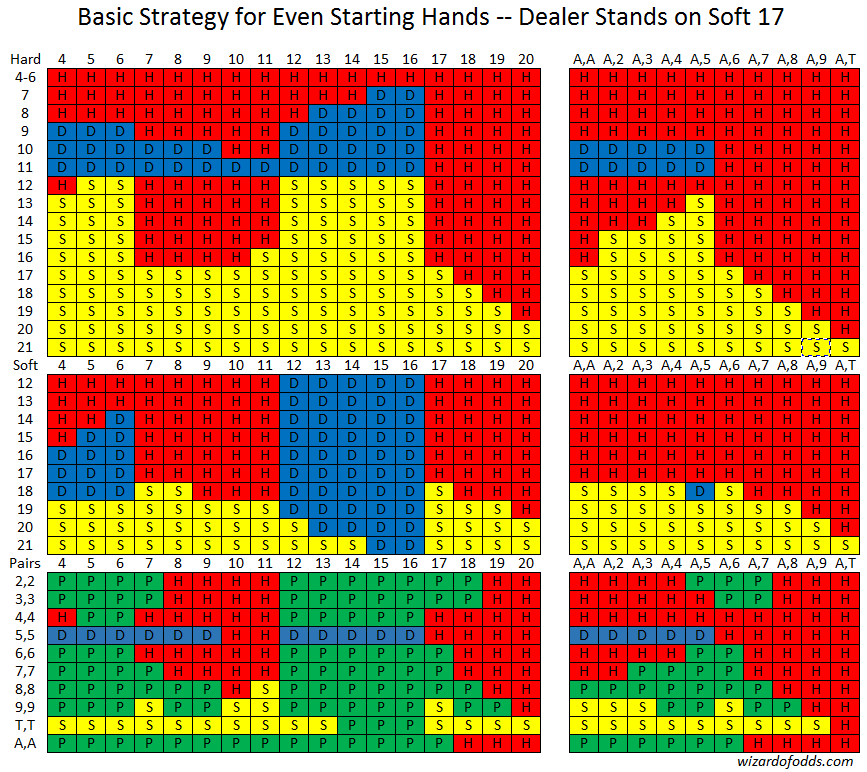 الاستراتيجية الأساسية التالية مخصصة للأيدي المبدئية ذات الأرقام الزوجية ، حيث لا يكون رهان Odds Win قيد اللعب، ويقف الموزع على 17 ناعمة.