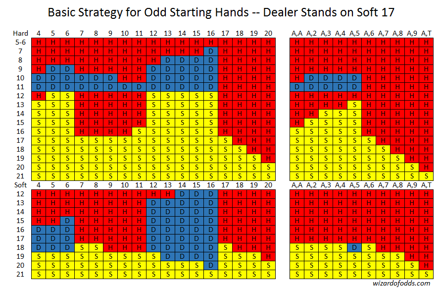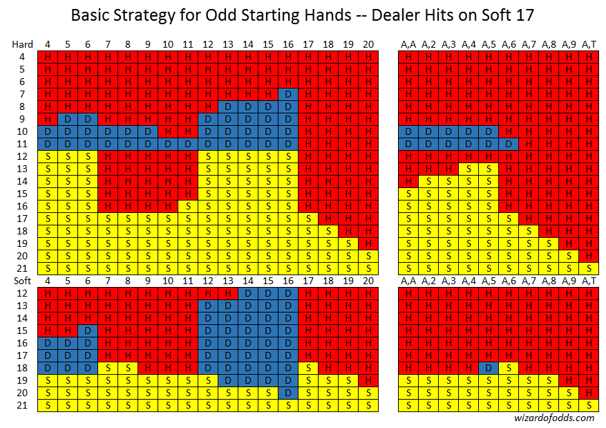 الاستراتيجية الأساسية التالية مخصصة للأيدي المبدئية ذات الأرقام الفردية ، حيث يكون رهان Odds Win لا يزال قيد اللعب، ويقف الموزع على الرقم 17 الناعم. ويتبع جدول الاستراتيجية الأساسية النهائي مفتاح A.